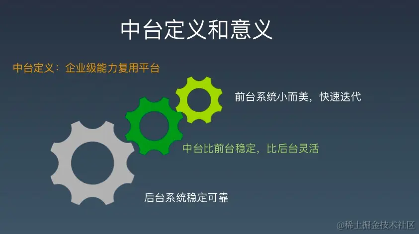 首先我们来看一下中台的定义,其实中台来源于前台,它更多的是为前台的创新,还有快速迭代服务。所以说中台是位于前台和后台之间的一层。相对于前台来讲,它比前台要更稳定;相对于后台来讲,它比后台要更加灵活。中台的意义在于企业级能力复用平台: