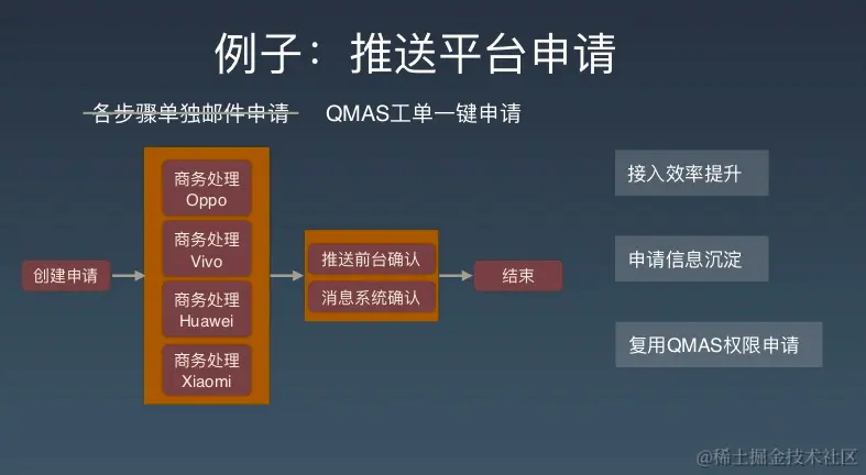举一个例子,以前一个推送平台的申请,大概要两周左右。创建一个申请,然后给各个公司的商务做审批,再发给爱奇艺的推送,爱奇艺的消息系统再确认。这些都需要邮件来往,非常麻烦。现在直接在 QMAS 上一键申请就好了,接入效率大幅提升,且信息得到沉淀,还能复用 QMAS 的权限申请。
