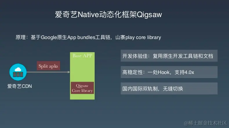 而我们要做的事情,就将它的 runtime 替换成 Fake 的一套,保证 runtime 接口是完全一样的,用爱奇艺的 CDN 替换 Google Player。原理就是基于 Google 一些原生的 App Bundles 工具链,山寨 Play Core Library,直接复用到原生的一些开发工具类和文档,开发体验非常好,稳定性非常高,我们只有一处 Hook,从 4.0 开始就支持了。另外就是国内国际双轨制可以做无缝切换,对于国内的开发来讲,它只用 Qigsaw 开发框架就好了,而对于国外的用户来讲,直接用 App 的开发环境就好了。开源地址:github.com/iqiyi/Qigsa…