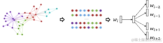 传统graph embedding方法主要基于图结构和某种节点序列采样策略生成序列数据, 并基于skip-gram方式学习节点embedding, 如图 6所示。典型工作包括DeepWalk, LINE, Node2vec, 三者主要区别在于序列生成的采样策略不同。传统graph embedding模型将所有节点视为ID, 仅能覆盖训练集中的高频节点, 无法获取新节点的embedding。