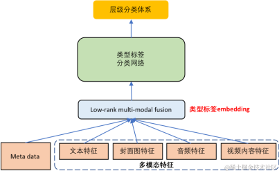 该类模型通常基于海量标注数据进行特定任务有监督训练,并抽取模型中间层或最后一层作为文本或视频的表征,比如基于标签分类任务的embedding模型(如图 3所示), 该模型基于视频元数据、文本、图像、音频和视频特征,在大规模标注数据上训练,识别视频的类型标签和内容标签。往往抽取模型fusion层的表示作为视频的topic粒度语义表征,可有效解决冷启动问题,广泛应用于推荐的召回、排序、多样性控制场景中。