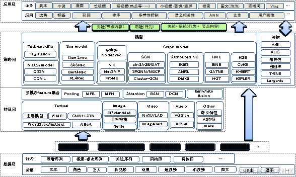 - 数据层: 主要搜集用户的各种行为数据构建节点序列和图,构建embedding模型训练数据;