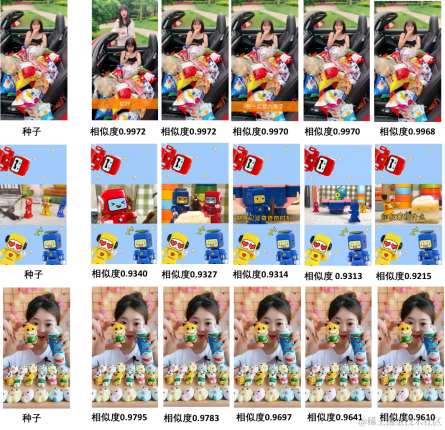 该类模型主要是基于State-of-Art的ImageNet图像预训练分类模型的中间层或最后一层,抽取图像或视频的纯内容表示,并基于自监督表示学习思想finetuning,作为图像或视频的语义表征,应用于去重(图 2)和推荐post-rank阶段多样性控制两种场景的效果较好。