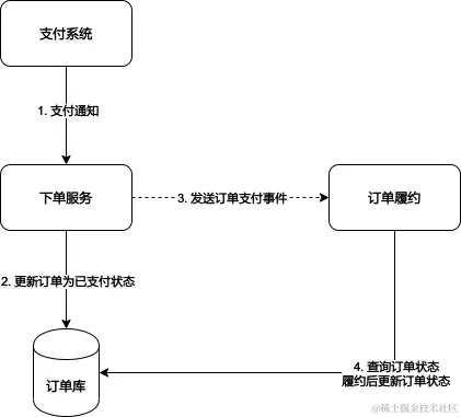 在正常流程中,订单履约服务收到订单支付事件后,会检查订单状态,如果此时订单状态为已支付,则进行履约流程的处理。但对于有履约延迟的订单,订单履约服务收到此订单的支付事件后,查询数据库发现此订单并非支付状态。经过调查,我们排除了数据并发覆盖问题,并且订单状态查询是发生在主库上,也不存在主从同步延迟问题。