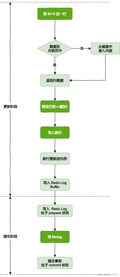 接下来看一下 MySQL 执行器和 InnoDB 存储引擎在执行简单 update 语句 update t set n = n + 1 where id = 2 时的流程(因为此例只执行单条更新语句,所以其自身就是一个事务)。