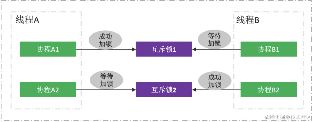 当线程A中的协程A2 要对线程锁2加锁⽽阻塞时,则会使线程A的协程调度器阻塞,从⽽导致线程A中的所有协程因宿主线程A被操作系统挂起而停止运行,同样,线程B 也会因协程B1 阻塞在线程锁1上⽽被阻塞,最终造成了死锁问题。