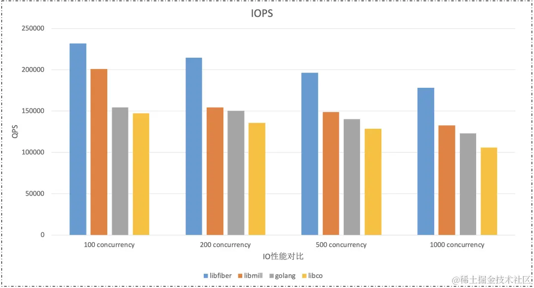 下图给出了采⽤ libfiber 编写的回显服务器与采⽤其它⽹络协程库编写的回显服务器的性能对⽐(对⽐单核条件下的 IO 处理能⼒):