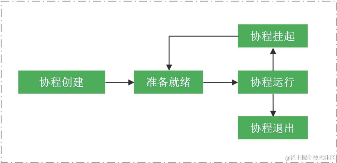 因此,存在于线程中的⼤量协程需要相互协作,合理地占⽤ CPU 时间⽚,在合适的运⾏点(如:⽹络阻塞点)主动让出 CPU,给其它协程提供运⾏的机会,这也正是『协程』这一概念的由来。每个协程一般都会经历如下过程: