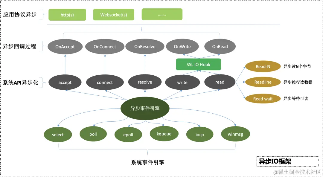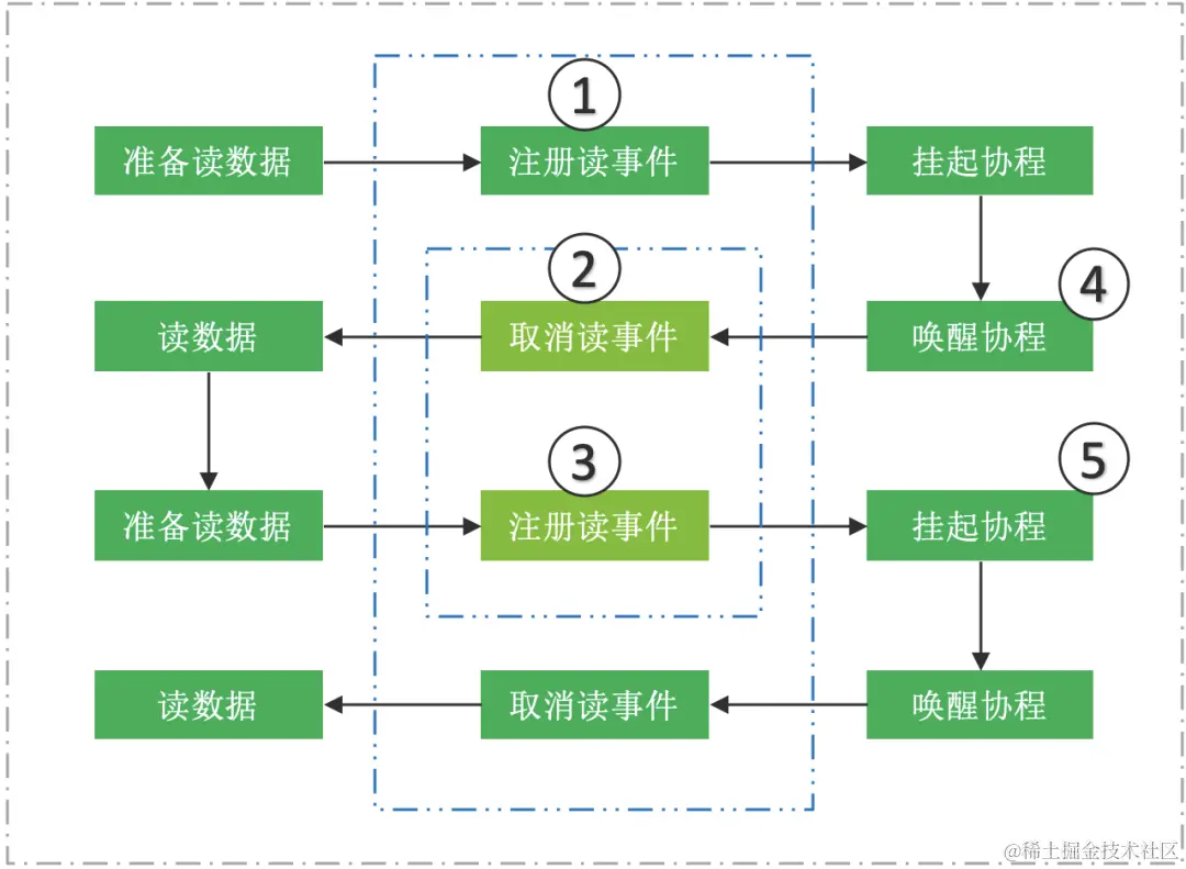 - IO 事件协程内部本身是由系统事件引擎(如:Linux 下的 epoll 事件引擎)驱动的,其内部 IO 事件的驱动机制和上⾯介绍的⾮阻塞过程相似,当某个套接字句柄『准备就绪』时,IO 调度协程便将其所绑定的协程添加进协程调度队列中,待本次 IO 调度协程返回后,会依次运⾏协程调度队列⾥的所有协程。
