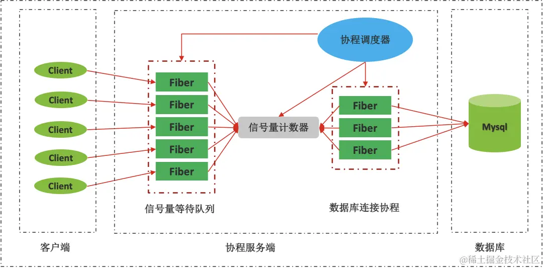 使⽤⽹络协程库编写的⽹络服务很容易实现⾼并发功能,可以接⼊⼤量的客户端连接,但是后台系统(如:数据库)却未必能⽀持⾼并发,即使是⽀持⾼并的缓存系统(如 Redis),当网络连接数比较⾼时性能也会下降,所以协程服务模块不能将前端的并发压⼒传递到后端,给后台系统造成很⼤压⼒,我们需要提供⼀种⾼并发连接卸载机制,以保证后台系统可以平稳地运⾏,在 libfiber 中提供了协程信号量(源码⻅:fiber_semc.c)。