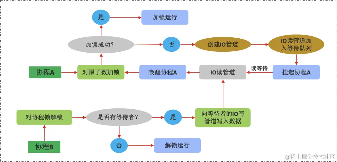 • 协程A(假设其属于线程a)想对该事件锁加锁时,对原⼦数加锁失败后创建IO管道,将IO读管道置⼊该事件锁的IO读等待队列中,此时协程A被挂起;