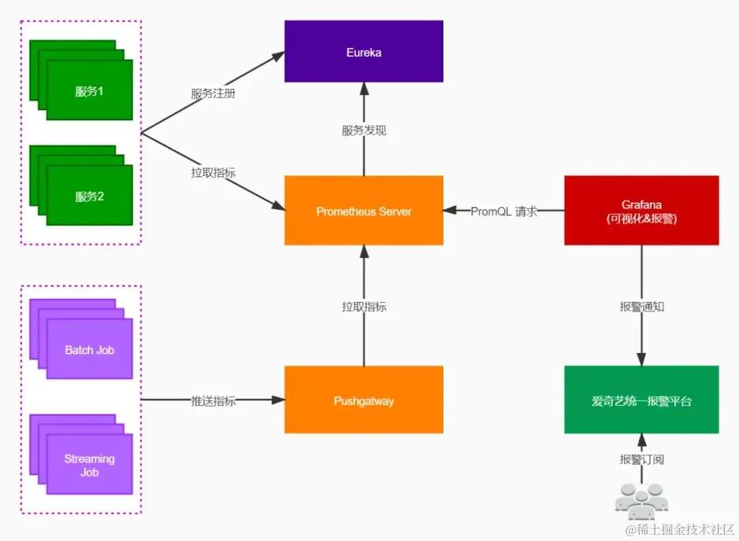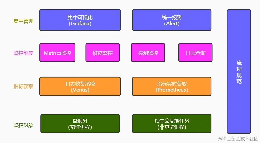 - 指标获取方式既可以基于Prometheus实时拉取,也可以基于Venus日志收集,前者用于指标实时获取,保证监控报警时效性,后者记录详细日志,用于具体问题排查和链路分析。