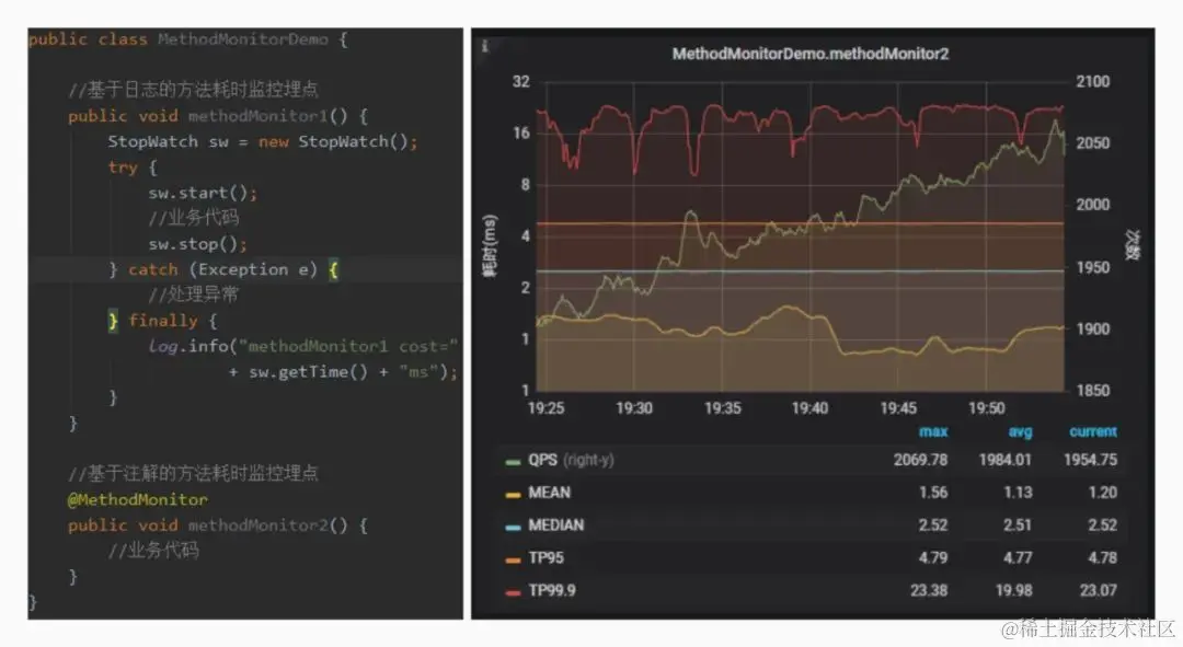 很多情况下,需要对某些业务方法耗时进行监控,传统的埋点方式是在方法入口和出口添加监控代码,业务代码侵入高,开发成本高。