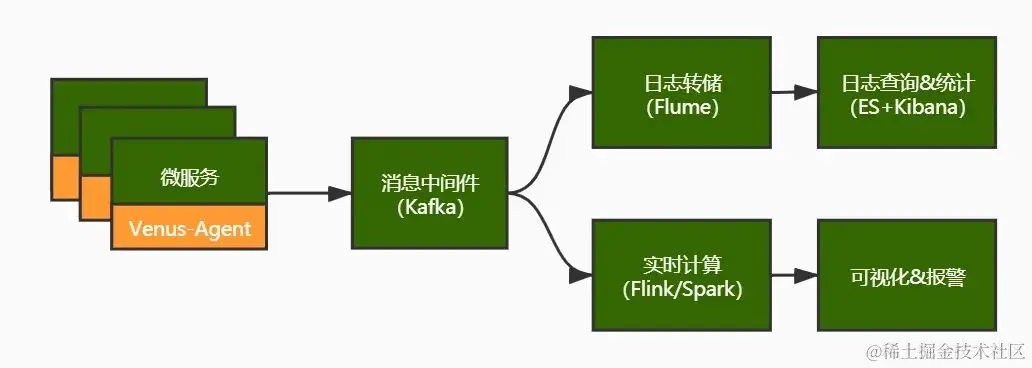 基于日志的监控方案,原理如下图,业界技术方案成熟(例ELK),公司也提供了通用解决方案(Venus),容易落地。缺点是,日志监控链路较长,延迟时间大,报警可能不够及时。