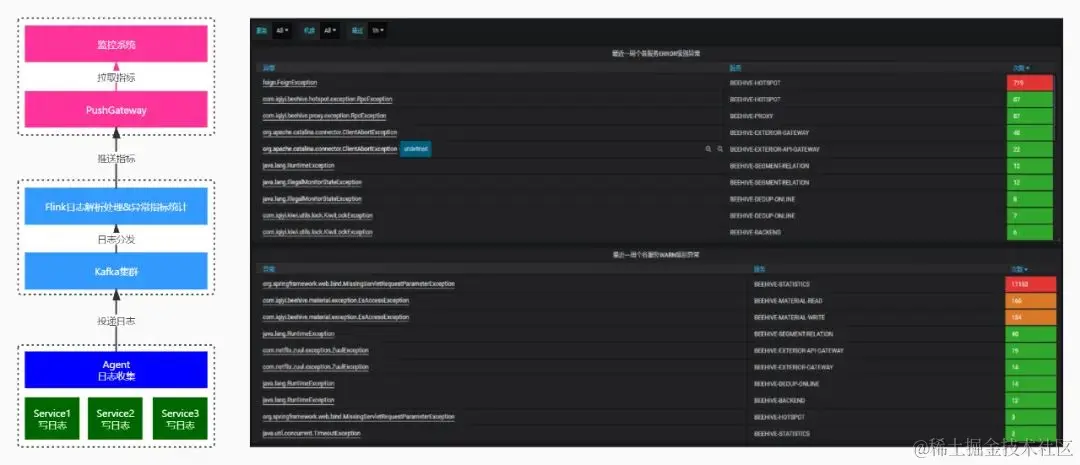 一种应用场景是,实时收集各个服务日志流中的异常信息。我们监听日志采集的Kafka消息,Flink实时解析出服务异常名称,将各个服务产生的异常实时推送到监控系统,并在Grafana上集中展示。基于Pushgateway的异常监控方案及效果图如下。