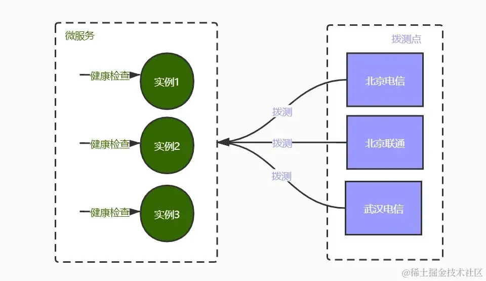 下图描述拨测监控的方案,主要包括微服务实例自发的健康检查和各拨测点定时拨测。