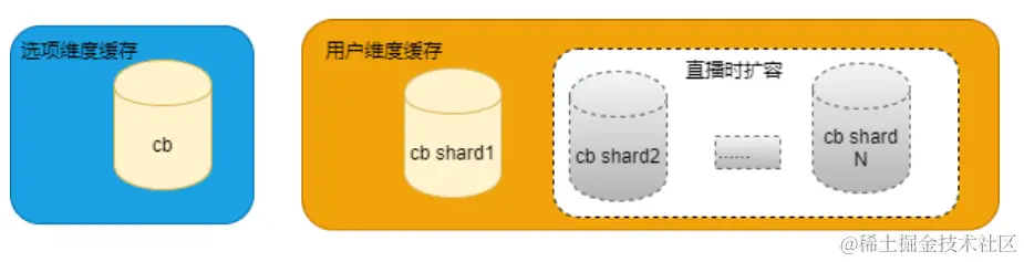 其中用户维度缓存,通过对UID做分片来分散读写压力和扩充单缓存集群容量的限制。并且大型活动本身有生命周期,缓存中的数据不必长时间保存,多个活动之间互相独立,可以针对活动具体的量级来灵活调整分片的数量,在活动前扩容,在活动后回收(数据在底层存储中另外有持久化)。节省了资源的同时,不用再对每个活动再定制化的做代码改造和优化。\