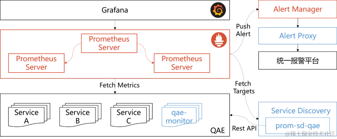 Prometheus服务发现的原理很简单,通过第三方提供的接口,Prometheus查询到需要监控的目标列表,然后轮训监控目标获取监控数据。由于QAE是私有云平台,Prometheus无法直接提供支持,但基于以上原理,我们可以实现类似的服务发现机制。
