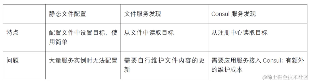 静态配置的方式最为简单,但在实际生产环境中并不可取。容器每时每刻都可能进行着创建和销毁,不可能通过静态配置方式设置监控目标。我们最开始选择了Consul的服务发现,它引入了集中的注册中心,微服务启动时向注册中心注册服务实例,Prometheus便可以从注册中心查询到服务实例作为监控目标。不过,我们最终并没有采用Consul,主要原因有两点,一是微服务接入Consul需要涉及代码改动,虽然改动不大,但大量服务的接入仍有不小的成本;二是还需要再单独部署和维护一套Consul环境,带来新的维护成本。