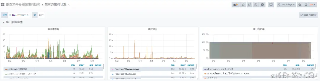 对于应用服务和第三方接口监控,我们常用的指标包括:响应时间、请求量QPS、成功率。