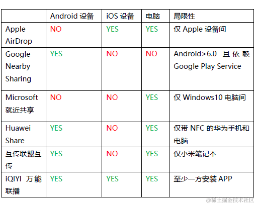 对比可见,系统级应用AirDrop和Nearby Sharing都未(可能也无意)真正突破跨设备、跨系统限制,同时由于缺乏GMS支持,Nearby Sharing在国内也难以普及;而终端厂商的Huawei Share和互传联盟互传,也都未突破品牌的限制,甚至未能适配品牌范围内的所有机型,这也就意味着Huawei Share或互传联盟均无法兼容大多数互传场景。而且手机和PC端的传输也十分受限。