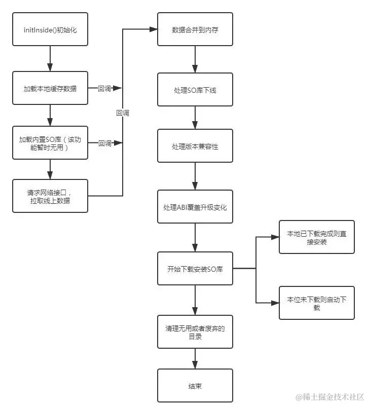 So库管理实现逻辑:客户端先加载本地缓存数据,同时拉取线上接口数据,两者数据合并之后,正确处理so实例对象状态,对于未安装的实例进行下载操作,下载完成后,依据业务方需要进行加载。具体的实现流程参考下图: