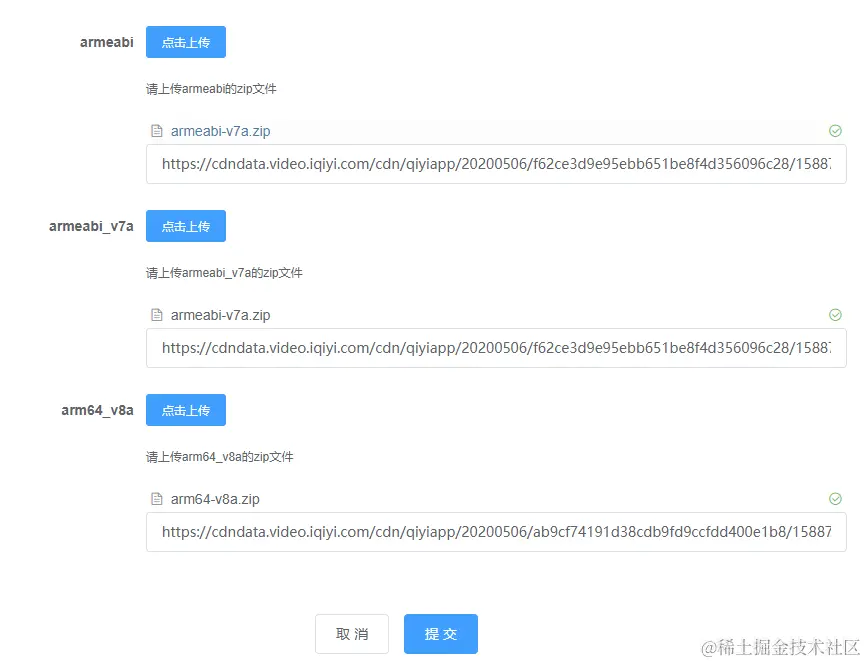 后端发布平台支持上传多种ABI类型的so库文件,后端接口根据前端上传的APP平台标识,APP版本号和APP运行时进程信息,下发正确的so版本和下载地址给前端。后端发布平台so库上传如下图所示: