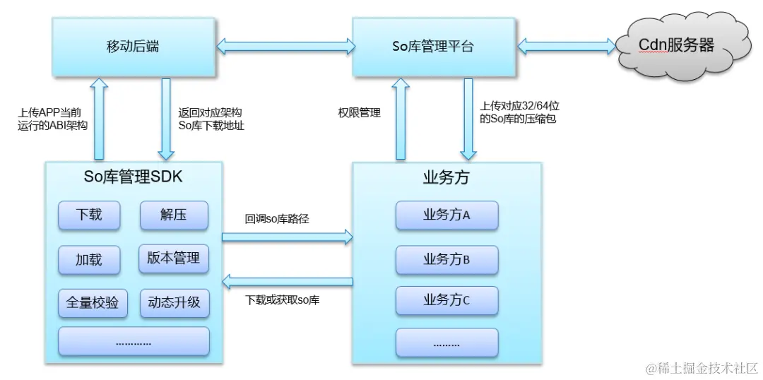 64位适配的动态加载so库的适配过程中,代码各个模块的动态so库,有不同的后台,对应不同的下载路径,就需要各个业务方针对自己的so库做适配,其工作量和沟通成本巨大,为了解决这一问题则设计了一个统一的so库管理平台,各个业务模块可以直接对接so库管理平台,后续新的so库的接入,由so库管理平台来支持适配工作就可以完美支持了。