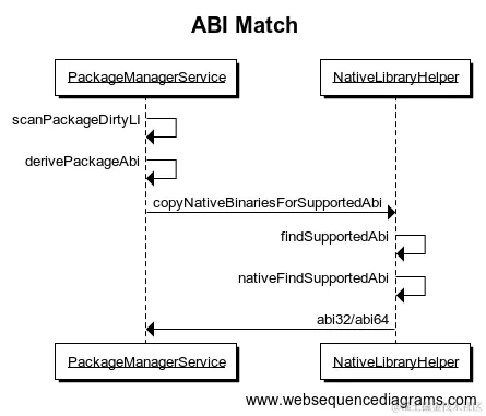 - 在APP安装的过程中,PMS里面的scanPackageDirtyLI方法通过遍历APK文件夹里面的lib下面的so库根目录,再结合该手机硬件支持的abilists列表,来决定primaryCpuAbi的值,具体请参考下图2-1的时序图: