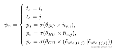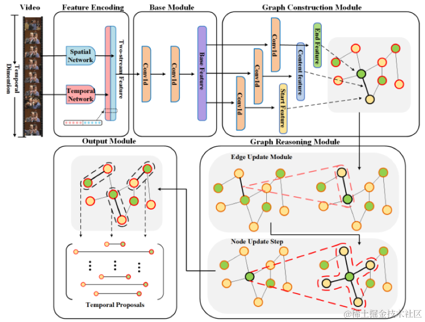 如 BC-GNN 的整体框架图所示,候选 proposal 由一对节点与连接它的边产生,并且其起始点、结束点和内容的置信度分别基于更新后的节点特征和边特征生成,具体过程如下所示:
