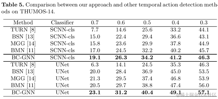 采用对 proposal 进行分类的方式得到时序行为检测结果,从上面两个图中可以看出,在两个数据上研究者提出的方法均取得领先的结果。