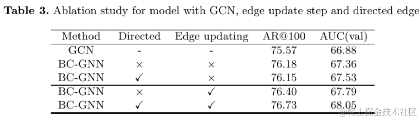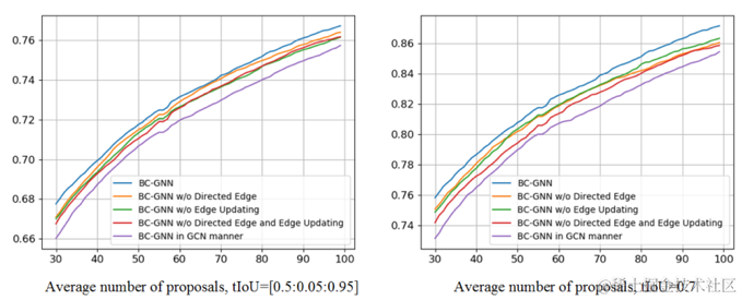 在 BC-GNN 算法中,相比于直接使用传统的 GCN,将无向图转变成有向图,并且增加了边特征更新步骤,为了验证这两个策略的有效性,在 ActivityNet-1.3 数据集的时序动作提名生成任务上进行了消融实验。从下图的表格和结果曲线上可以看出,这两种策略均有利于结果的提升。