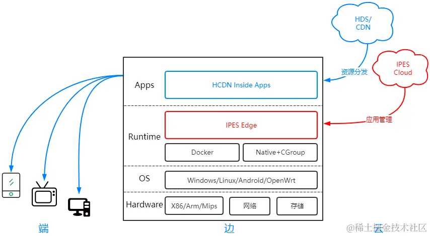 基于 IPES 边缘计算服务平台,可以方便的接入设备和部署各类应用。目前 IPES 已经接入百万台设备,覆盖了 X86、ARM和 Mipsle 等各类 CPU 架构设备,支持 Linux、Windows 和 Openwrt 等操作系统。主要承载着点播的缓存应用,也运行了部分包括直播缓存应用、视频会议应用、广告违规物料检测等十多个应用。
