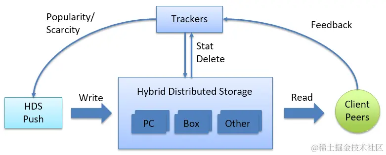 供给侧和需求侧与边缘缓存节点一起构成一张巨大的分布式存储分发网络,需求侧(Peers)对获取的边缘节点和资源进行读取并反馈给网络中的大脑 Trackers,Trackers 按照边缘节点的分布、资源的稀缺,再结合需求侧的反馈等信息,对分发的资源和节点进行调整。供给侧(HDS Push)根据 Trackers 的决策结果,往存储网络中写数据。