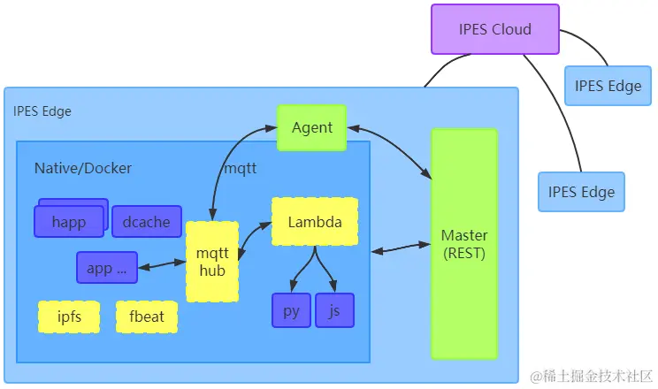 - Master是边缘端主进程,提供本地 API 接口,并负责所有模块和应用的生命周期,基于 Native 和 Docker 两个应用 Engine,支持 Native 和 Docker 应用的混合部署