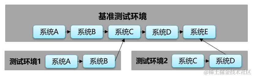 一套测试环境搭建完成后,首要目标是保证该套测试环境连通、可用,因为不能连接线上服务,所以在部署完成所需的系统后,所依赖的系统如何部署,直接决定了资源的利用率。因此,我们采取智能链路判断的方案,一方面保证新的测试环境连通、可用,一方面最大程度复用现有的基准测试环境保证资源利用率最大化。