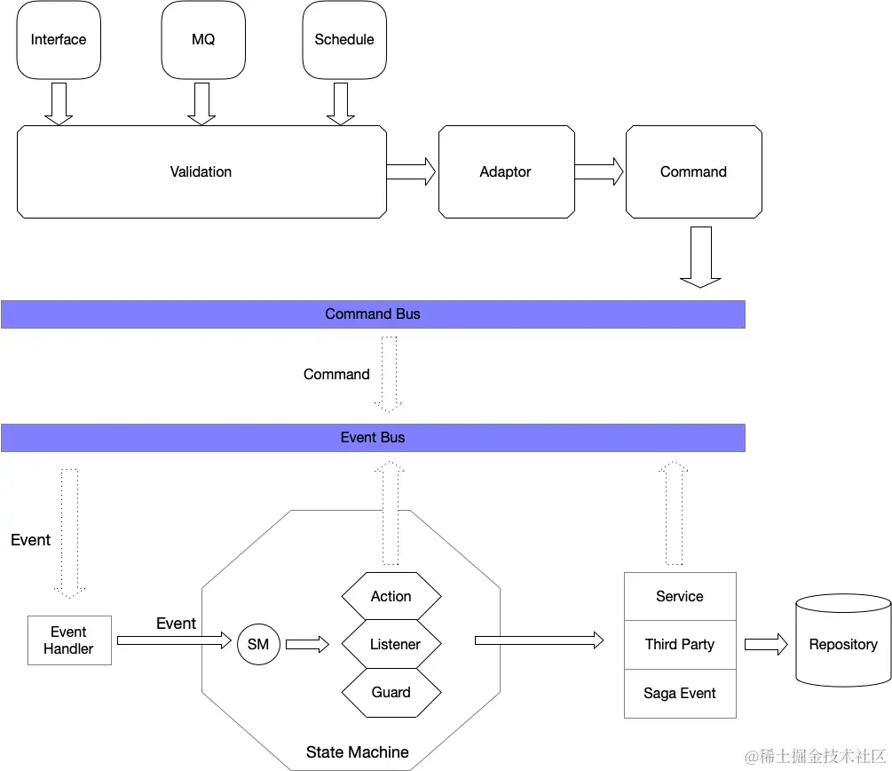 - 领域层:接收到领域事件,转换成状态机Event,驱动状态机进行状态更迭,触发对应业务逻辑处理;