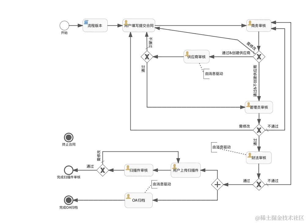 项目1.0版本采用的是Activiti工作流作为引擎设计实现的,基于Activiti特性,可以严格控制每一步状态的流转,历史操作事件都会记录到系统数据库中,对于线上问题排查有一定的优势。但是学习成本较大,需要开发人员了解框架系统的二十多张表功能、使用BMPN进行流程定义设计等。图1-5是最初版本的流程设计图: