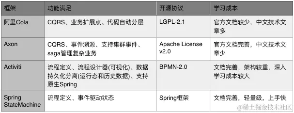 爱奇艺号合同中台面向用户提供签约功能,从发起签约到运营审核、供应商、采购单、扫描件、归档等流程漫长,状态颇多,业务较为复杂,同第三方系统交互较多,对于有问题数据需要进行定位和回溯。项目初期为了更好的满足这些需求,我们调研了一下比较成熟的框架,包括Cola、Axon、Activiti、Spring StateMachine等,图1-1是框架的一些对比: