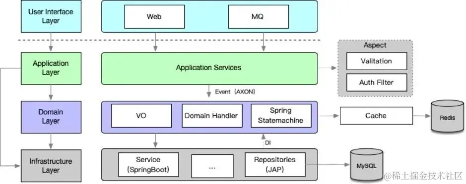 - 应用层:接口参数校验、组装业务参数,转换成Axon Command进行命令分发;