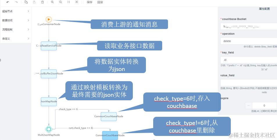 1. 操作简单,提供了可视化的业务编辑器,可以通过拖拽的方式完成业务开发;业务编排完成并发布后,会生成业务描述配置信息并存入云配置中心后续供同步引擎使用;如下图所示为业务开发的编辑器,最左侧是各自逻辑插件的列表,可以直接拖到中间的画布上组合形成完整的业务处理流程。通过右侧的属性配置表单可以为每个逻辑节点指定业务相关的配置参数,比如限流配置,重试配置,关联服务授权信息等。