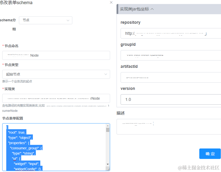 3. 提供逻辑节点插件管理。扩展插件实现约定的编程接口并在后台里导入后,就可以在业务编辑器里使用。需要指定插件所在的仓库坐标、逻辑实现类全路径名,同时在录入时可以定义插件的属性配置表单。一般数据同步业务都是后端开发同学来完成,后端一般比较熟悉相关业务逻辑,相对来说完成插件后台的逻辑扩展不存在门槛,但是由于需要将逻辑插件和可视化编辑器进行集成,涉及到前端页面的开发,这往往是后端同学不熟悉的领域。为了避免后端同学学习前端的成本,我们将属性表单的生成做成了拖拽式的,无需前端技术基础也可以快速完成表单的开发。