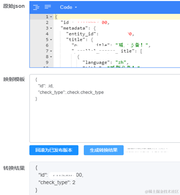 2. 提供实体映射模板管理功能。映射模板描述了如何将一个json数据转换为业务需要的数据,开发同学可以在后台对模板进行调试。可以通过实体转换逻辑节点按照映射模板来完成字段的转换。后期新增和修改字段逻辑时,只需要调整模板重新发布即可生效,不用再拉分支修改代码,从而更加快速的完成需求交付。当前线上已经发生多次10分钟内交付业务需求的案例。