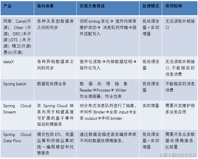 基于上述这些问题,我们希望寻求维护成本更低、开发效率更高的解决方案。为此我们对数据同步相关产品进行了调研,结果发现大部分都是面向异构数据库的同步,或者只能支持批处理任务,抑或不能方便扩展访问外部接口, 综合下来并没有发现能较好适配我们业务场景的。当然调研的这些产品很多特性为我们提供了重要的参考,比如dataX的插件机制和Spring Cloud Data Flow的编排能力给了我们很多启发。