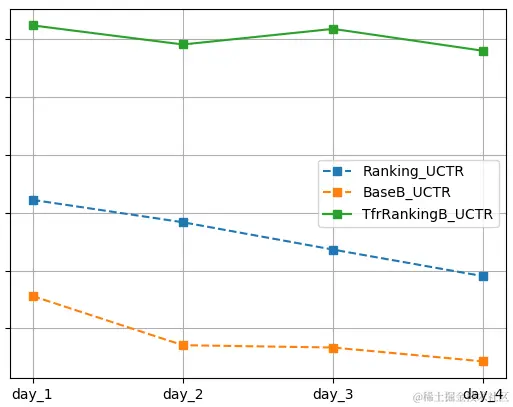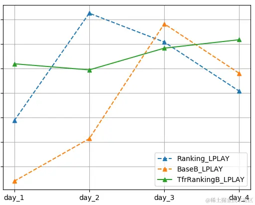 以上的几处不同是模型训练方式和评估指标上的不同,这也正是采用TFR框架带给我们的。而训练数据和模型本身,包括正则化项在内,TfrRankingB和Ranking是完全一样。两个模型训练后,与BaseB一起在线上真实流量环境下测试完整4天,其中day_1和day_2为平日,day_3和day_4是休息日。线上实验考查用户的CTR(点击率)、UCTR(用户点击率)和LPLAY(长播放占比),效果如下: