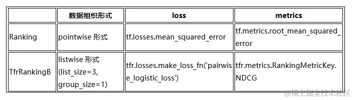 其中,TfrRankingB相比较于Ranking,模型结构完全一致,也就是采用同一个Scoring Function,训练数据集也完全一致。但是由于TfrRankingB采用TFR框架训练的LTR模型,模型优化上有以下几处不同: