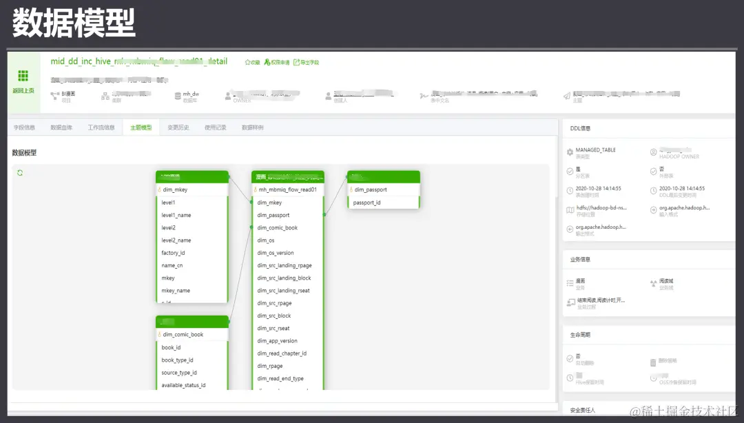 ▇ 生成物理表,同时将表的业务元数据信息录入到元数据中心,与模型完全对应,表名、字段名、字段类型等信息标准化、统一化。