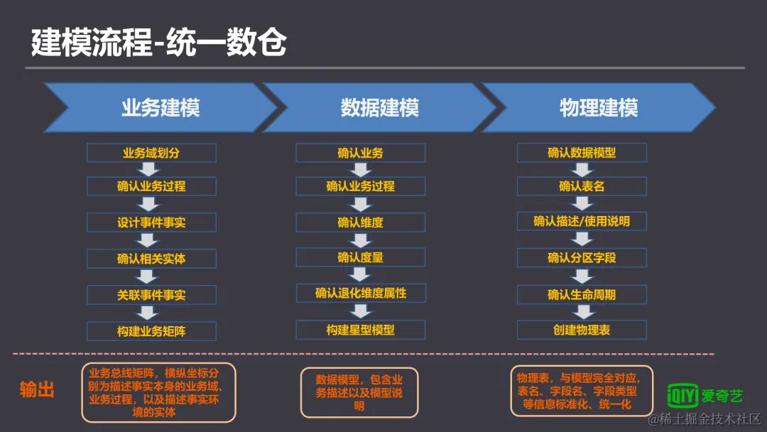 统一数仓建模是业务层建模的基础,需要涵盖尽可能多的业务过程和维度,包括业务建模、数据建模和物理建模三个阶段。