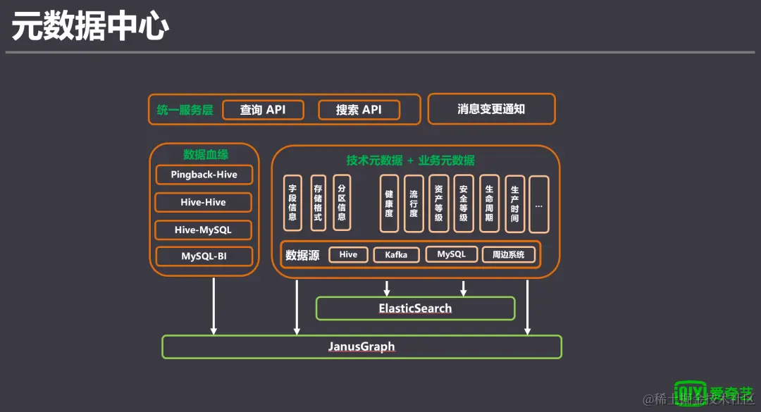 下图是元数据中心的架构图,在底层使用开源框架Atlas,并针对性的进行二次开发,JanusGraph存储元数据信息和数据血缘,ES提供统一的元数据搜索服务。