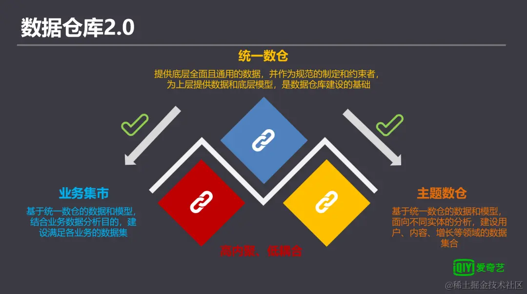 纵观整个数据仓库2.0架构,从分层来讲跟1.0的区别不大,主要分为原始数据层、明细层,汇总层、应用层以及统一的维度层,上图可以看出,对整个数仓组成做了较大调整,划分为三个部分,分别为统一数仓、业务集市和主题数仓,同时也明确了每个组成部分的分工、定位以及相互之间的数据引用流向。